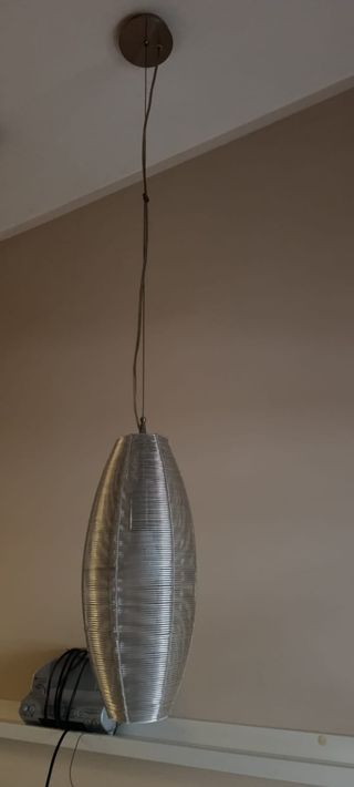 Vendo due eleganti lampadari a sospensione a filo singolo con finitura metallica semi lucido lavorato a coste con design a forma di uovo come foto lo rende un pezzo d’arredo unico Stefano 40.00 Euro entrambi vendo anche singolarmente.