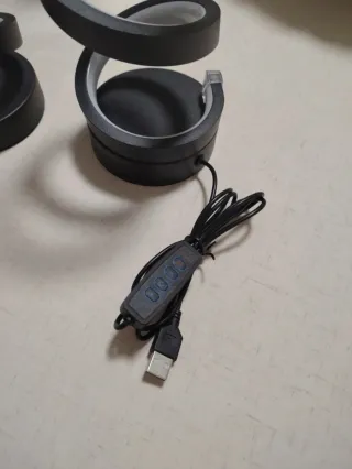 Lampada da scrivania con un design moderno e flessibile. - Testa luminosa ad anello. - Collo flessibile per orientare la luce. - Base rotonda con porta USB.