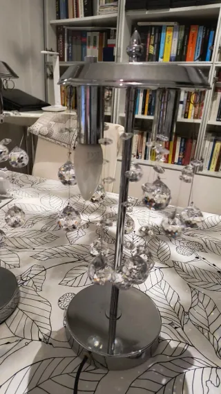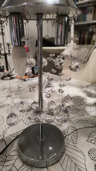 2 Elegante lampade da tavolo, perfette per comodino o scrivania. Il design con pendenti in cristallo aggiunge un tocco di raffinatezza. - Struttura in metallo lucido. - Pendenti in cristallo sfaccettato. - Lampadina inclusa. Prezzo per tutte due