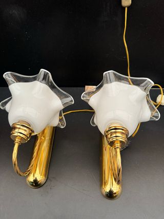 Elegante coppia di applique da parete con un design raffinato. - Montatura in metallo finitura oro. - Paralumi in vetro bianco lavorato.