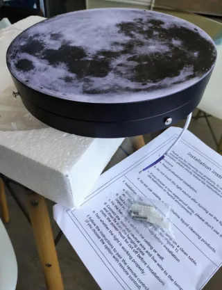Lampada da soffitto a forma di luna, con un design unico che porta un'atmosfera magica in ogni stanza. La finitura esterna è nera, mentre la superficie interna riproduce fedelmente la texture lunare. Ancora imballata con istruzioni di montaggio e viti incluse per l'installazione a soffito o parete. - Design a tema lunare. - Struttura in metallo e plastica.