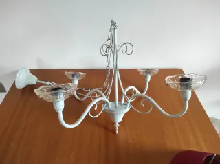Elegante lampadario in stile shabby chic, perfetto per aggiungere un tocco di classe a qualsiasi ambiente. La sua struttura in metallo bianco si abbina armoniosamente ai dettagli in vetro trasparente. - Design raffinato con riccioli decorativi. - Finitura bianca opaca. Lampadario shabby chic Maison du Monde unico nel suo genere. A scelta è possibile montarlo con dei paralumi in vetro graziosi, bassi del diametro di 10 cm Oppure con dei paralumi a tronco di cono rossi diametro max 20 cm diametro min 8.5 cm. Il lampadario inclusa la catena è lungo circa 118 cm e largo circa 55 cm (senza paralumi)