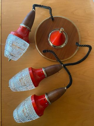 Lampada a sospensione a cascata a tre pendenti Mid-Century. La base è una plafoniera in alluminio con puntale interno e gancio di fissaggio rifinito sul lato a vista in legno con cromature lucide e laccato rosso, da in cui scendono tre punti luce dall’altezza regolabile. I pendenti richiamano la plafoniera con in legno scuro laccature rosse e vetro o cristallo trasparente lavorato in grado di dare splendide sfumature e giochi di luce. Realizzato in Italia negli Italia, anni ‘60 ‘70. L'impianto elettrico e originale dell' epoca ed è funzionante. Il lampadario è in perfette condizioni lievi segni sulle parti non a vista