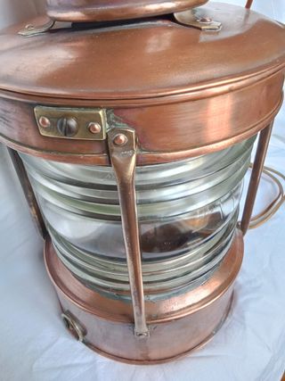 Lampada da nave in rame con dettagli in vetro. Un pezzo d'arredo nautico appartenuto marina navale inglese risalente inizio 900 - Struttura in metallo. - Elementi in vetro trasparente.