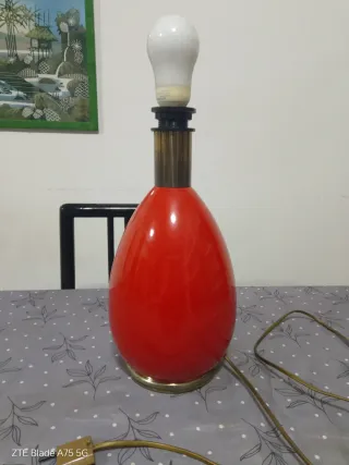 Lampada da tavolo dal design unico a forma di uovo. Mancante di coperchio - Base in metallo dorato. - Corpo lampada in metallo rosso lucido. - Portalampada in plastica nera.
