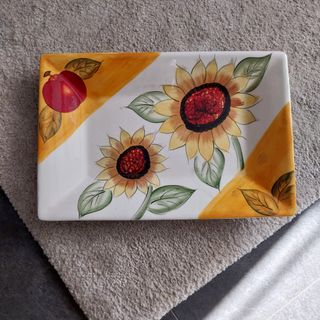 Bellissimo vassoio in ceramica, decorato con girasoli e dettagli gialli. Perfetto per servire snack o come elemento decorativo. - Motivo a girasoli e frutta - Forma rettangolare