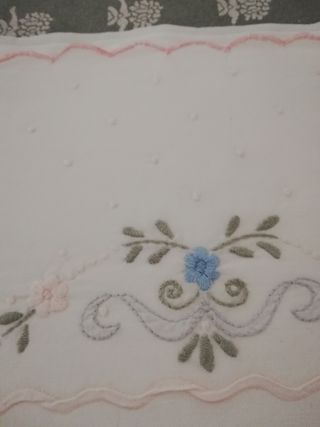 Lenzuola matrimoniale sopra completo di 2 federe in puro cotone ricamo a macchina e rifinito punto smerlo misure federe con balza 97x62 senza 77x51 nuovo lavato senza macchie o aloni euro Ritiro gratuito