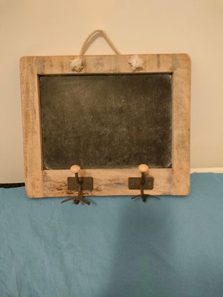 Lavagnetta doppio uso, per scrivere con gessetto lista spesa o altro, con doppio appendini per canovaccio, presine, o quello che si desidera. Misure 30x25