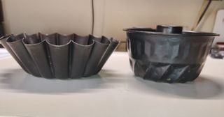 Set di due stampi per la preparazione di dolci. - Uno stampo a forma di fiore con bordi ondulati. - Uno stampo a ciambella con scanalature. Lo stampo a ciambella presenta delle rigature di colore marrone. dimensione stampo a ciambella diametro 16 cm diametro interno 5 cm altezza 9 cm dimensioni stampo a fiore diametro superiore 18 cm altezza 7 cm