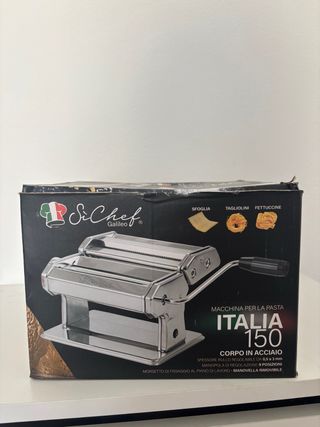 Macchina per la pasta SiChef Italia 150 in acciaio. - Corpo in acciaio. - Spessore rullo regolabile da 0,5 a 3 mm. - Manopola di regolazione a 9 posizioni. - Morsetto di fissaggio al piano di lavoro. - Manovella rimovibile.