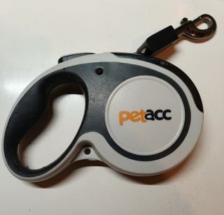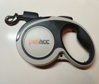 Guinzaglio retrattile della Petacc lungo fino a 5 metri con una portata di 50kg. Grazie al moschettone che può essere riutilizzato la corda può essere tagliata alla misura voluta, vedi ultima foto. La maniglia è un po' sciupata, è venuto via il rivestimento in gomma, ma niente che comprometta la funzionalità del guinzaglio.