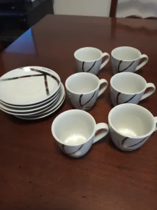 Set di Tè in porcellana firmate Pierre Cardin Paris. 6 tazze, 6 piattini, lattiera e zuccheriera. Non so se originariamente la lattiera aveva un coperchio.ma non c'è in questo set. Tazze 7 x 8 cm, piattini diametro 15 cm, lattiera alto 10 cm diametro 7 cm, zuccheriera alto 10 cm diametro 10 cm, teiera alto 17 cm diametro 15 cm (escluso manico).
