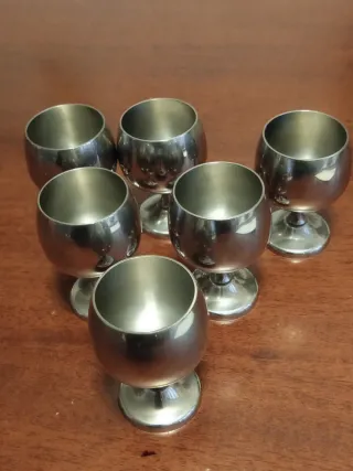 Set di sei calici per liquore A.M.C. peso di ogni calice 46 gr. Altezza 6 cm diametro 3,5 cm - Realizzati in acciaio. - Design elegante e moderno.
