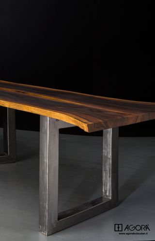 Tavolo composto da 2 tavole di noce Italiano scortecciate e oliate, su gambe in ferro spazzolato e trattato, spessore legno 4,5 cm