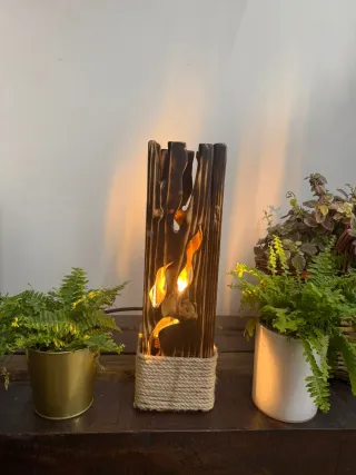 Lampada artigianale in legno, un pezzo unico che aggiunge un tocco rustico alla tua casa. La base è avvolta con corda per un dettaglio naturale. - Design unico con intagli a forma di fiamma. - Realizzata con cura artigianale.