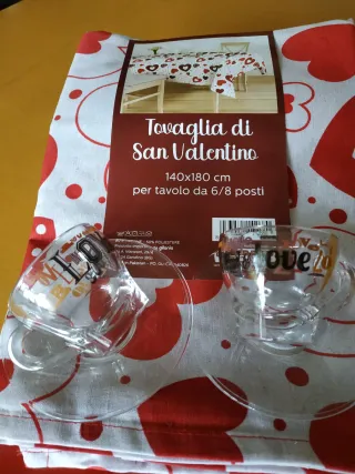 Set coordinato per San Valentino con due tazzine e una tovaglia. - Due tazzine in vetro con piattini. - Tovaglia a tema cuori, misura 140x180 cm. - Adatta per tavoli da 6/8 posti. - Made in Italy.