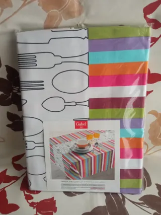 Tovaglia rettangolare Gabel in puro cotone, ideale per 6/8 persone modello Panama. Presenta un design vivace con righe colorate su un lato e un motivo di posate stilizzate sull'altro. - Prodotto certificato privo di sostanze nocive. - Tessuta, stampata e confezionata interamente in Italia.