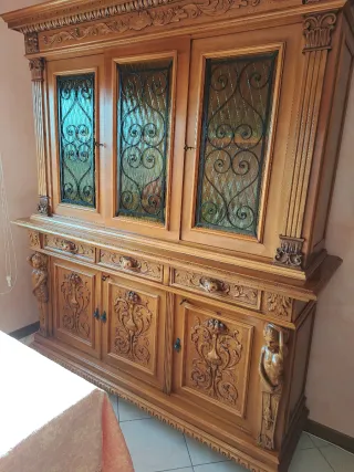 vendo mobili in stile rinascimentale, in legno noce massiccio, credenza, tavolo con 6 sedie, porta tv, tavolino da salotto e lampadario con angioletti. copie fatte a mano da artigiani Lecchesi 40 anni fa, in ottimo stato da vedere e toccare con mano. per solo amanti.