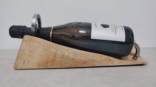 Portabottiglie in legno di Faggio con inserti in ferro battuto interamente lavorato a mano. Ottimo per impreziosire una bottiglia di vino, champagne pregiato da 0,75l. La levigatura a mano e il trattamento superficiale con cera ne esalta le venature e la bellezza del faggio mentre gli inserti in ferro battuto per bloccare la bottiglia creano un giusto mix dei materiali.