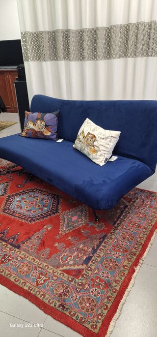 Divano letto in tessuto microfibra blu.