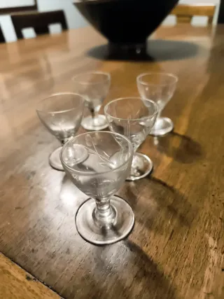 Set di cinque piccoli bicchieri da liquore con un delicato motivo inciso. - Design elegante e raffinato. - Perfetti per servire digestivi o liquori. - Aggiungono un tocco di classe alla tavola.