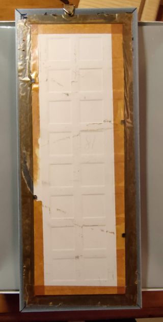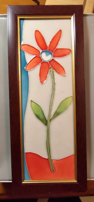Quadretto floreale, realizzato su vetro su piastrella, con cornice in legno. Dimensioni 15 x 34 cm.