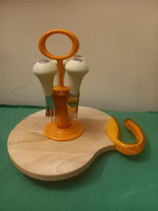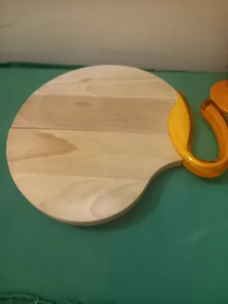 Set da formaggio con tagliere in legno e accessori. - Tagliere dalla forma irregolare. - Supporto per accessori arancione. - Set di 3 utensili con manici bianchi e inserti metallici.