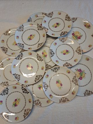 Set di piatti decorativi in porcellana con un motivo floreale di rose gialle e bordeaux e decorazioni in oro, marca BAVARIA. Il set include 11 piattini dolce e 2 piatti torta.