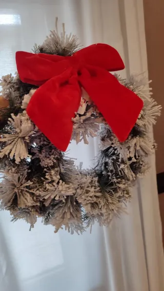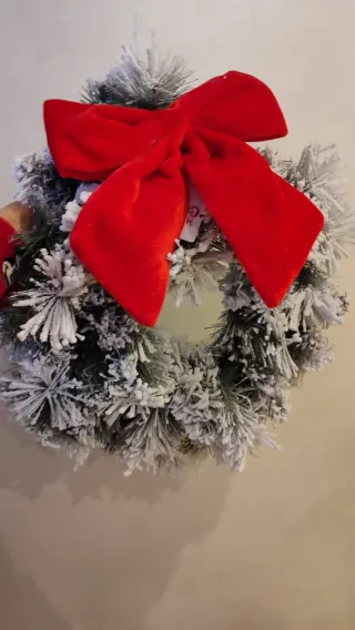 Ghirlanda natalizia decorata con un grande fiocco rosso. - diametro 48 cm - Ideale per addobbare la casa durante le feste. - Dettagli innevati per un tocco invernale.