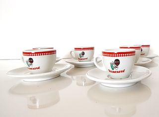 - 6 tazzine caffè Romcaffè “ Ercole d’oro 1970 mano bianca”, marchio GINORI, con relativi piattini - 4 tazze Romcaffè cappuccino “ Ercole d’oro 1970 mano bianca”, marchio ACF, senza piattini Misure: Tazzina caffè D 6cm ; H 5cm. Tazza cappuccino D 8cm: H 7,5cm Sono presenti segni dovuti al tempo, visibili in foto. Dal 1925 , la Elio Romagnoli Romcaffè produce “ il caffè dal sapore che rimane “.Slogan con cui l’azienda vanta la persistenza al palato del sapore del proprio caffè , indice fondamentale per attestarne la qualità. Per COLLEZIONISTI ma non solo . Per altre info Facebook " Le cose di Egle" o Instagram "lecosedie"