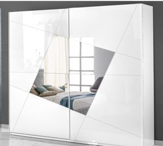 Elegante armadio con ante scorrevoli a specchio, perfetto per una camera da letto moderna. Include due comodini coordinati. - Design geometrico con pannelli a specchio. - Finitura lucida bianca.