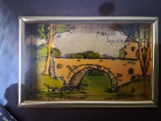 Bellissimo quadretto con lamina d'oro 22k. - Opera originale di Francois Lepetite. - Cornice in legno con dettagli dorati. - Raffigurazione di un ponte su un fiume. - Dimensioni cm 12,5x10