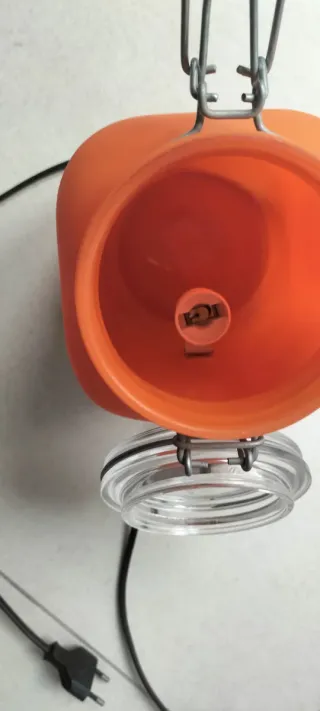 Lampada da tavolo dal design moderno e accattivante. - Corpo in silicone arancione. - Coperchio in vetro trasparente. - Chiusura ermetica con ganci in metallo.