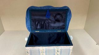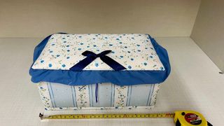 Elegante cesto porta oggetti, perfetto per riporre piccoli oggetti o come elemento decorativo. - Fantasia floreale con fiori blu su sfondo bianco. - Bordatura e dettagli in tessuto blu. - Fiocco decorativo blu sul coperchio.