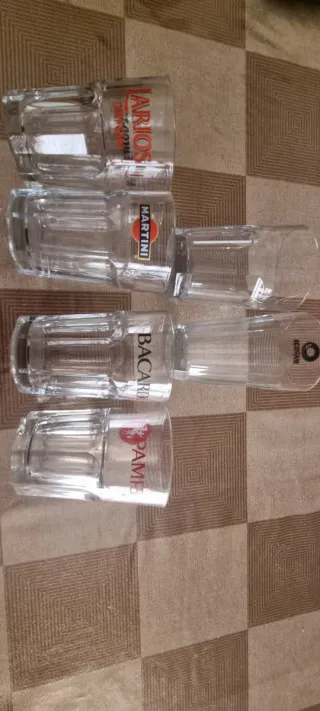 Set di 6 bicchieri da shot con diverse serigrafie. Tumbler alti - Bicchieri con marchi: Larios, Martini, Bacardi, Pampero. - Design trasparente.