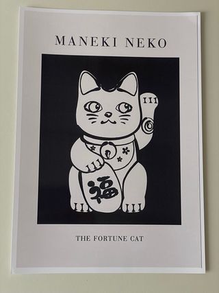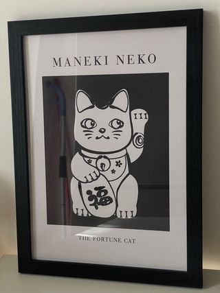 Bellissimo quadro Maneki Neko - The Fortune Cat con cornice nera, pronto da appendere. - Dimensioni del quadro: 22,3 x 30,9 cm. - Stampa su carta di alta qualità. - Cornice in legno.