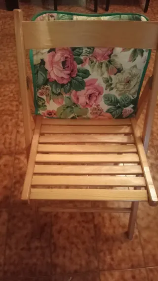 Set di quattro sedie pieghevoli in legno, perfette per aggiungere un tocco di stile e praticità alla tua casa. La seduta è imbottita per un maggiore comfort. - Struttura in legno resistente. - Seduta con rivestimento in tessuto floreale.