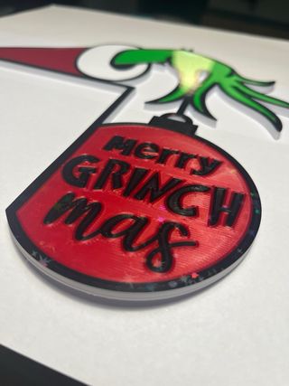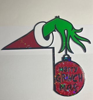 Decorazione a tema natalizio ispirata al Grinch, da applicare all’angolo della porta, perfetta per aggiungere un tocco di allegria. - Design a forma di mano del Grinch che afferra un ornamento. - Ornamento con la scritta Merry GRINCH mas. - Dettagli glitterati sull'ornamento.