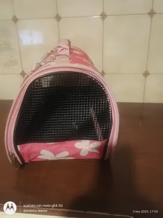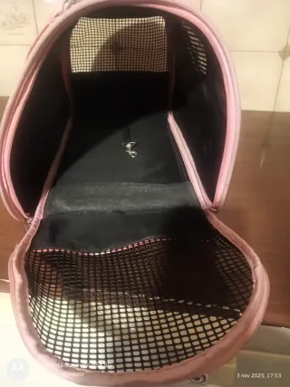 Borsa per il trasporto di animali domestici, ideale per viaggi o spostamenti. - Realizzata in tessuto resistente. - Design a rete per una buona ventilazione. - Chiusura con cerniera. - Dotata di un moschettone interno per agganciare il collare o la pettorina dell'animale.