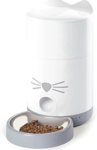 Mangiatoia automatica per gatti, dal design moderno e divertente. - Serbatoio capiente per il cibo secco. - Erogazione programmabile. - Ciotola rimovibile per una facile pulizia.