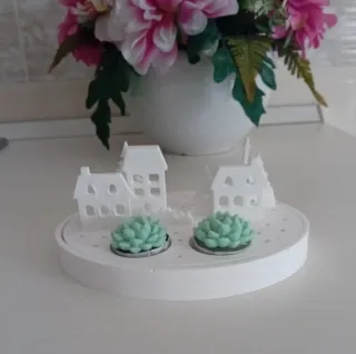 Delizioso ornamento decorativo con casette e piante. - Design a tema villaggio. - Elementi verdi a forma di pianta. - Struttura bianca.