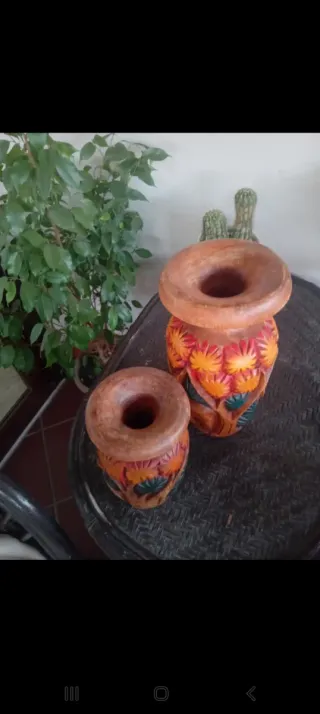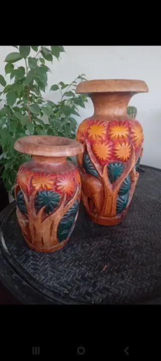 Bellissima coppia di vasi in legno con intagli floreali. - Realizzati in legno. - Design con motivi floreali e foglie. - Finitura colorata.