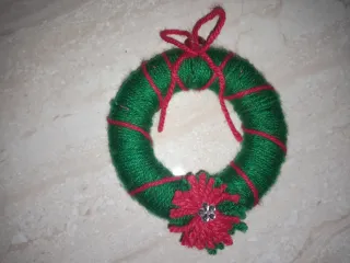 Deliziosi addobbi natalizi realizzati a mano con lana colorata, perfetti per decorare la tua casa durante le feste. - Decorazione a forma di ghirlanda. - Dettagli in lana rossa. - Fiocco decorativo con brillantino.