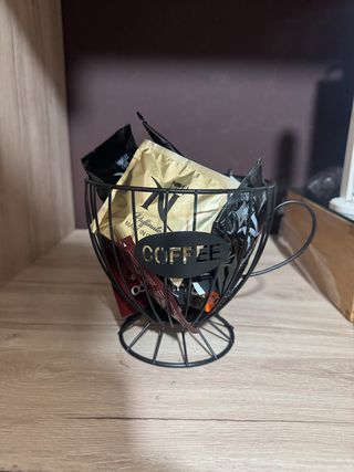 Elegante porta cialde o capsule per caffè, a forma di tazza. - Design a forma di tazza. - Realizzato in metallo. - Colore nero. Portacialde o porta capsule questo cestino è adatto sia in arredamento tipo shabby, moderno, classico nella sua semplicità è un oggetto di arredo funzionale per conservare dolcetti snack