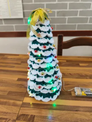 Delizioso alberello di Natale realizzato a mano, perfetto per aggiungere un tocco festivo alla tua casa. - Decorato con luci a batteria. - Rifinito con un fiocco dorato in cima. - Dettagli con perline rosse e dorate.