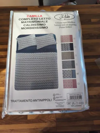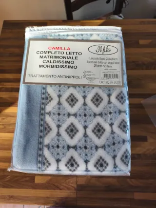 Completo letto matrimoniale Camilla in pile, molto caldo e morbido. - Lenzuolo sopra: 240x280 cm - Lenzuolo sotto con angoli maxi - 2 federe: 52x82 cm - Trattamento antipolvere