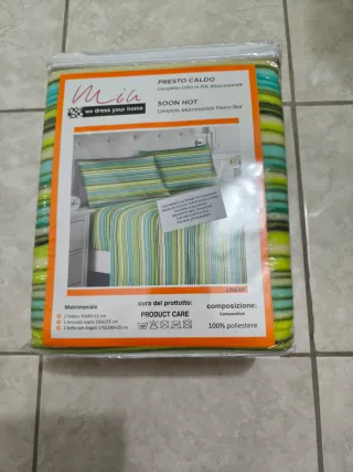 Completo letto matrimoniale Mia in pile, caldo e confortevole. Ideale per le notti invernali. - 2 federe (50x80+15 cm) - 1 lenzuolo sopra (230x255 cm) - 1 sotto con angoli (170x190+25 cm) - Composizione: 100% poliestere