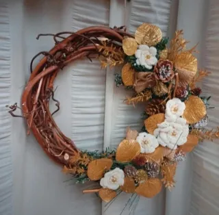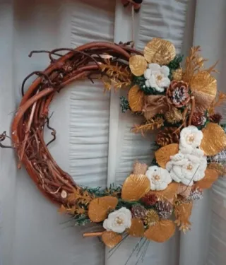 Bellissima ghirlanda natalizia creata a mano con cura. - Base in rami di legno intrecciati a mano - Decorazioni con fiori all'uncinetto e foglie dorate. - Dettagli con pigne e nastri. - Perfetta per un tocco festivo unico.