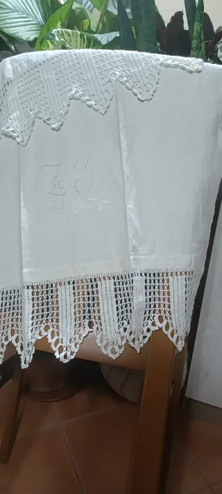 Elegante asciugamano vintage realizzato a mano in tela antica. Presenta ricami delicati e un bordo in pizzo all'uncinetto. - Iniziali ricamate: F G - Bordo in pizzo lavorato all'uncinetto - Tessuto in lino antico