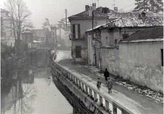 dipinto ad olio su tavola in legno raffigurante un canale innevato, ispirato a una foto d'epoca. I colori sono suggestivi della stagione invernale creando un'atmosfera nostalgica. - Dipinto realizzato ad olio su pannello in legno. - Soggetto: canale della Martesana a Milano con edifici sulla riva, innevato.